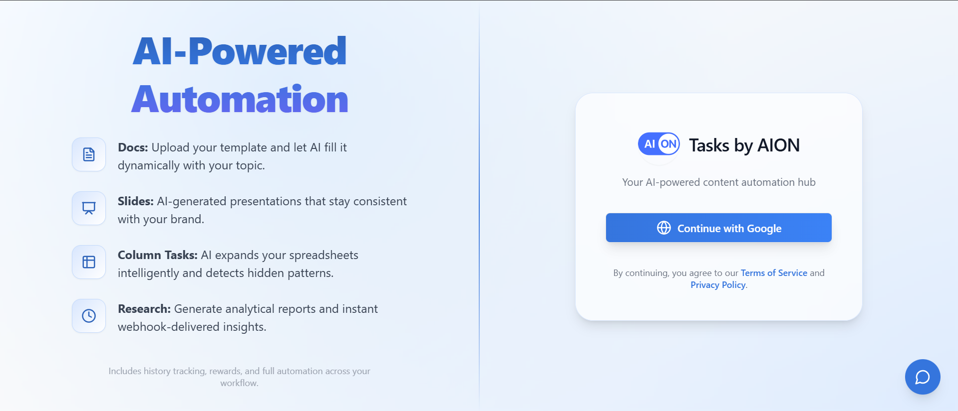 Aion Tasks is an AI-powered automation platform built to streamline documentation, research, and productivity workflows. The system allows users to upload document templates and dynamically generate content using AI, create on-brand AI-generated slide decks, intelligently expand spreadsheets with pattern detection, and run advanced research that delivers instant insights via webhooks. It integrates multiple AI engines to deliver faster, smarter task execution with a focus on automation at scale.